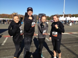 On race day, Team Aeroshot, consisting of me, Lauren from Fitness Magazine, Abby from Shape Magazine, and Stephen from The Roosevelts, a men’s lifestyle website, met up at the crack of down (okay, 7:45am) to make our way to Englishtown, NJ. Upon arrival, we got suited up in our Team Aeroshot garb, pinned our race bibs on and got inked in permanent marker on our foreheads.